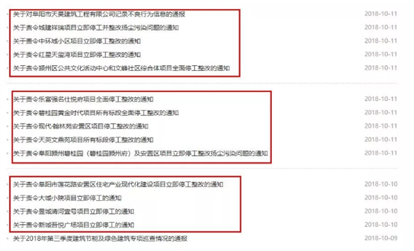 另外,在阜阳市住建委网站可见,近两日,当地多个项目都被停工整改!原因竟都是扬尘污染问题!