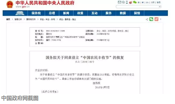 6月21日,国务院发布《关于同意设立“中国农民丰收节”的批复》,同意自2018年起,将每年农历秋分设立为“中国农民丰收节”。具体工作由农业农村部商有关部门组织实施。中国政府网截图上午10时,农业农村部
